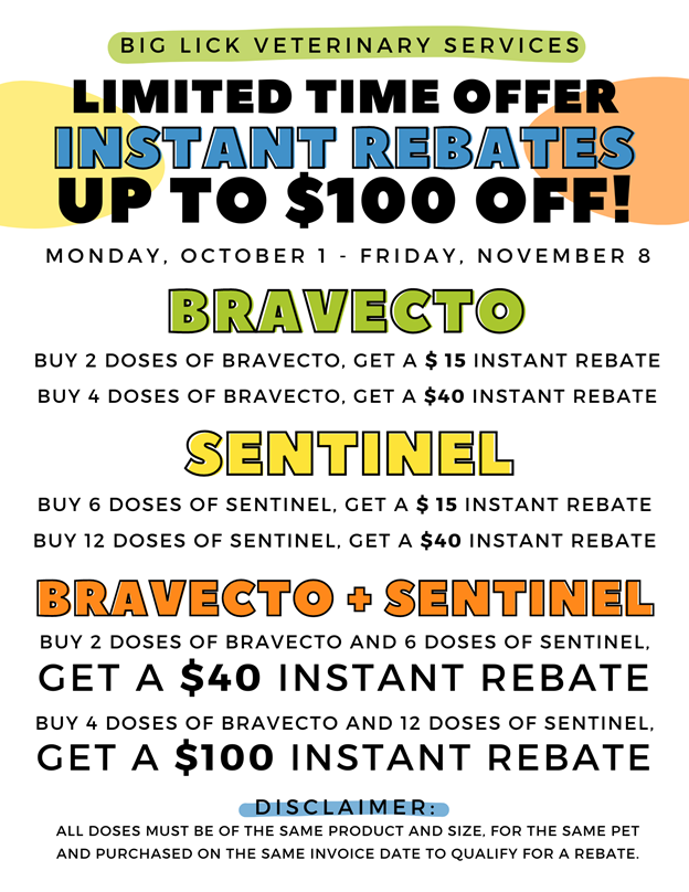 Now through November 8th, get up to $100 off your invoice instantly when you purchase Bravecto and/or Sentinel! This is a limited time offer and the best rebate offer of the year so we encourage clients to take advantage of it while it lasts and make sure your pet is protected from fleas, ticks, and heartworms! Call us today at 540-776-0700 to order your pet’s prevention.