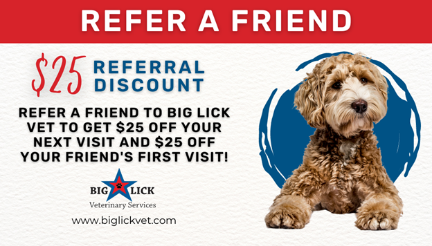 A referral is the highest compliment we could receive, so to say thank you we’ve re-launched our Refer A Friend program! When you refer a friend to Big Lick Vet and they mention your name when scheduling or checking in for their first appointment, we’ll provide you both with a $25 credit on your account to use towards your next visit.
