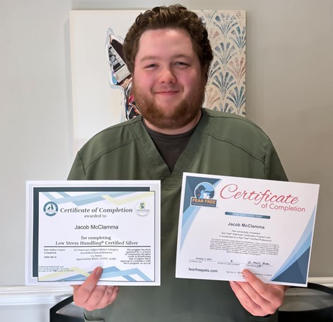 We’re excited to share that Vet Assistant Jacob is now both Fear Free certified and Low-Stress Handling certified. Not only did Jacob complete both of these certifications, he completed them while working full time and going to Vet Tech school full time – truly impressive! Jacob’s commitment to continuing to learn, grow, and elevate his skills is inspiring and we’re lucky to have such a dedicated professional like him on our team. These certifications will provide him with even more tools and knowledge to address different levels of fear, anxiety, and stress in patients, improve client communication, and increase workplace safety. Way to go Jacob! We’re so proud of you.